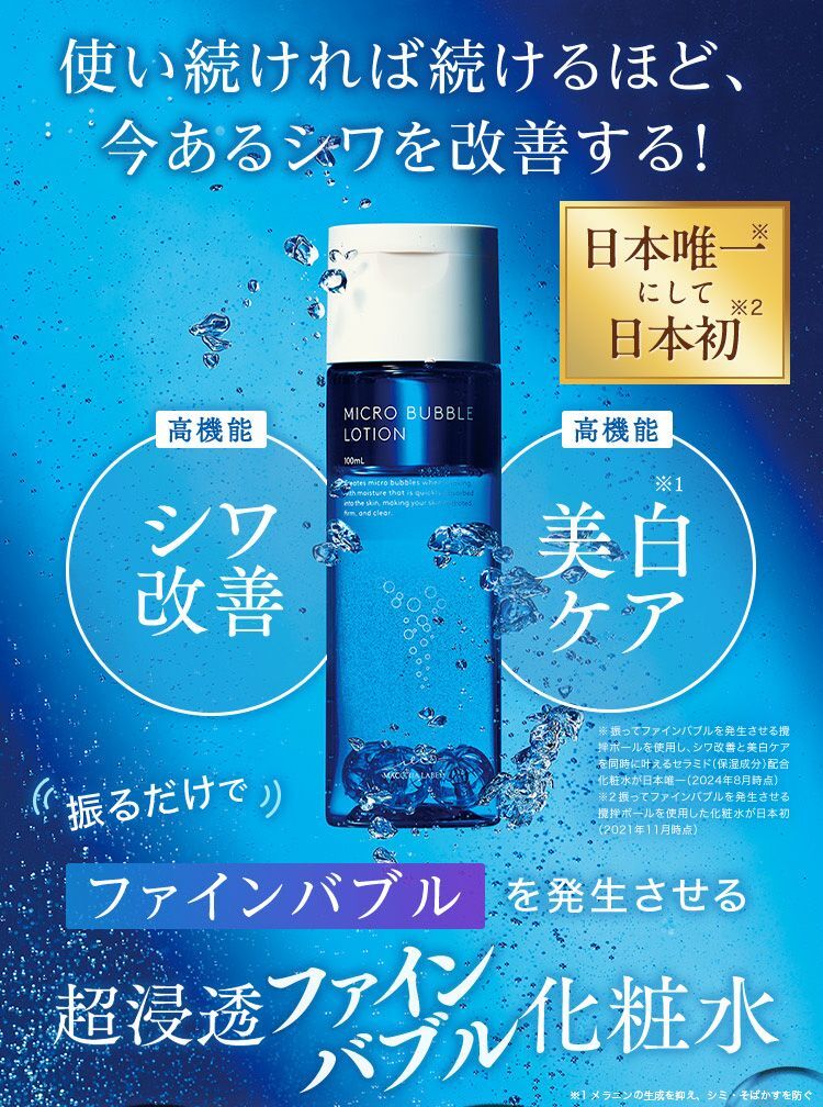 *振ってマイクロバブルを発生させる攪拌ボールを使用し、シワ改善と美白(メラニンの生成を抑え、しみ、そばかすを防ぐ)ケアを同時に叶えるセラミド(保湿成分)配合化粧水が日本唯一(2024年8月時点)